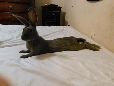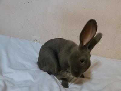 The only other breed with the mandolin body type and blue coloration is the Beveren. Adult Beveren female rabbits weigh 9 - 12 pounds, and the blue color should be: "a clean shade of light lavender blue..."