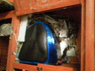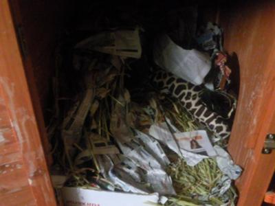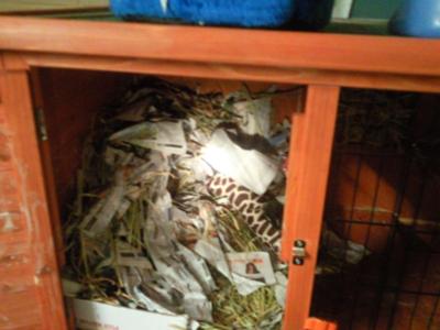 2) Yeah, if I were you, after putting something solid underneath all the pieces in there, I'd also give it a layer of shavings if possible. The shavings help soak up moisture, and keeps the nest sweet-smelling. As 'lovely' as the nest is, the rabbit won't miss all the toys she stuffed in there. Feel free to yank 'em all out now. While you're at it, give her big handsfull of hay and straw to use in case she thinks she needs to embellish the nest.